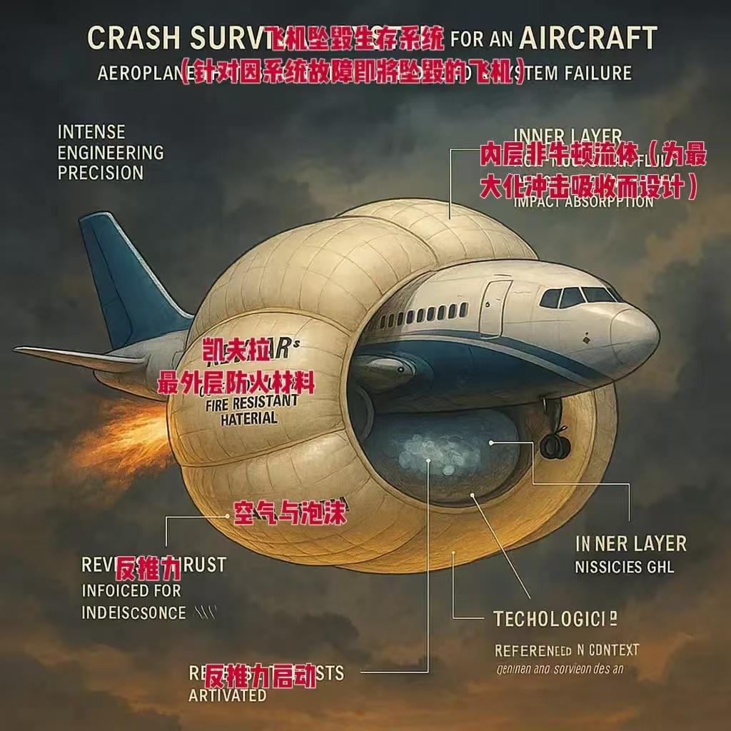 一个就是想办法尽可能让飞机下落速度减慢,减少飞机落地时的冲击,然后在座椅周围安装一个“非牛顿体保护套”,确保乘客不会被甩飞,也不会被其他物体伤害,最后一重保护则是在飞机壳装上安全气囊包裹住机身,保证飞机能“软着陆”。