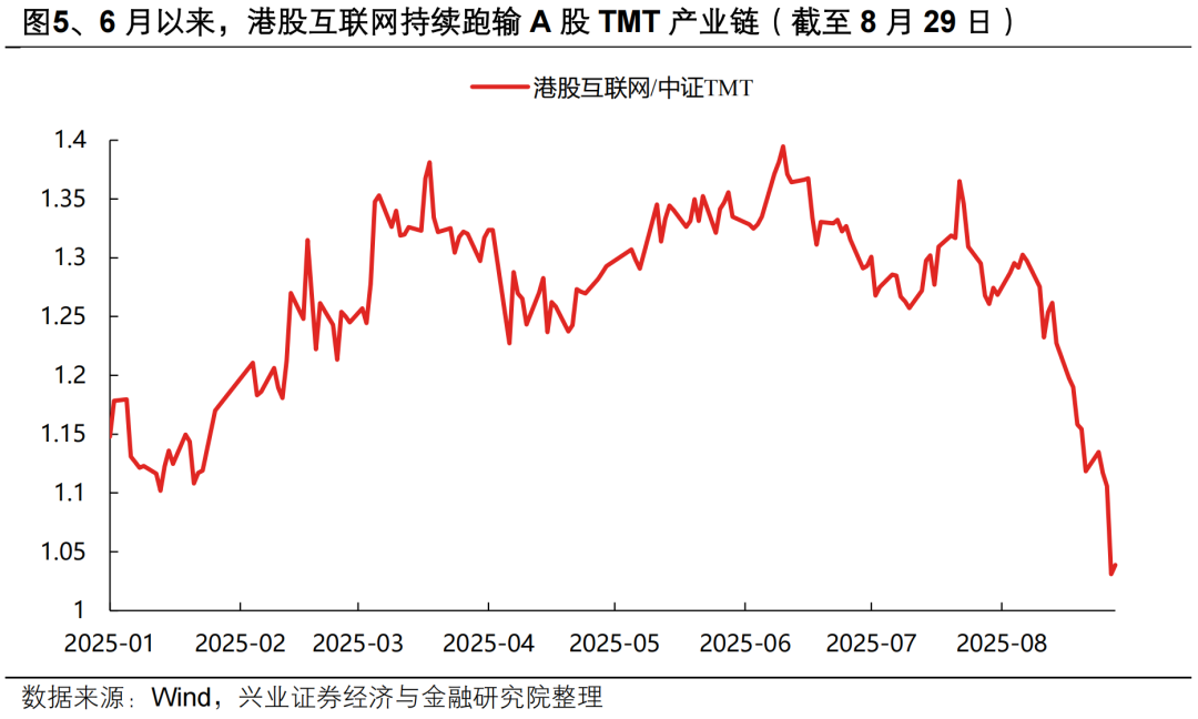 港股互联网:6月以来,港股互联网持续跑输A股TMT产业链,后续港股互联网具备多重补涨逻辑:第一,美国新一轮降息周期有望启动,利好外部流动性敏感、此前受压制较多的港股互联网;第二,阿里最新一季云收入、资本开支均超市场预期,有望带动板块逐渐从“外卖内卷”叙事,回归AI叙事、科技成长叙事,有利于板块估值修复;第三,AI行情向中下游扩散,具备最佳社交场景和生态的互联网平台作为应用落地率先受益的方向,扩散逻辑更加顺畅。