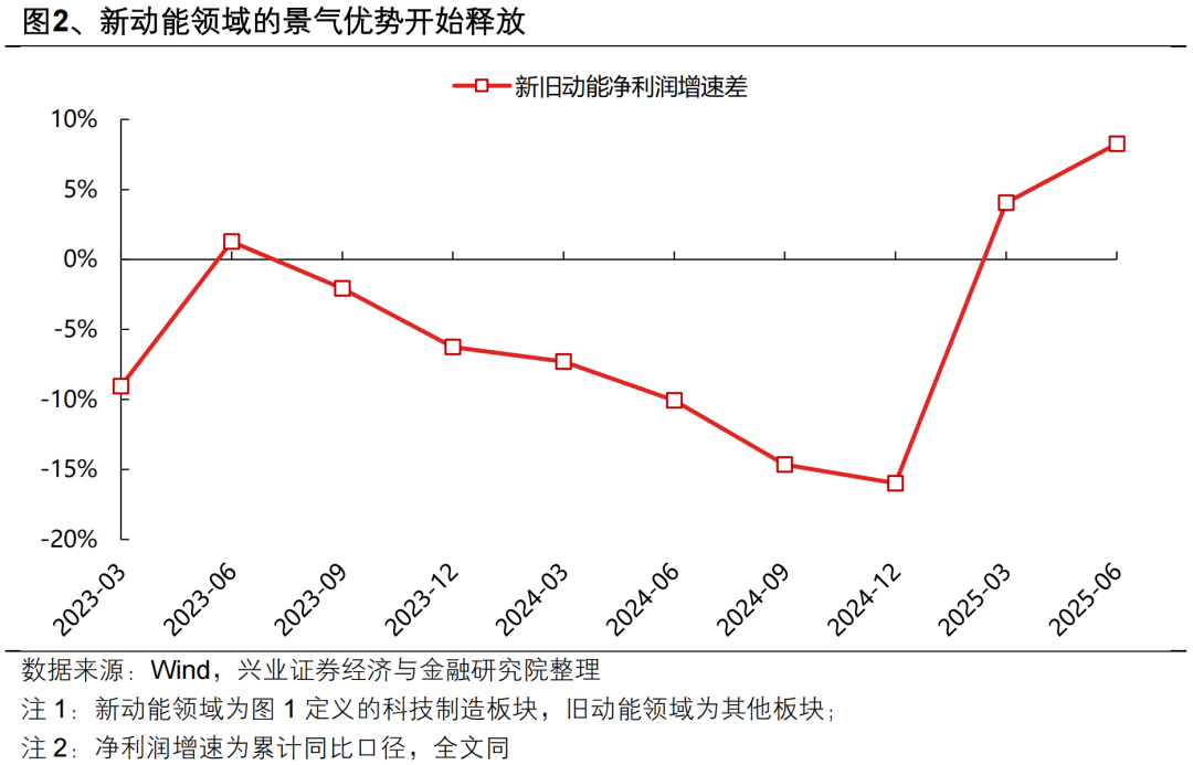 如此行情特征的背后,则是国内经济在经历过去数年的转型升级之后,新动能领域的景气优势开始释放,奠定了本轮“科技成长牛”的底色。今年以来,我国持续在AI、半导体、机器人、军工、创新药等各类领域全球竞争力不断加强、产业亮点不断涌现,带动市场信心活化的同时,更实质性地转化为新动能领域的景气优势。25Q1,以科技制造板块为代表的新动能领域与旧动能领域的净利润增速差已经转正至4%,25Q2进一步上行至8.3%。新动能领域的景气优势持续释放,奠定了本轮“科技成长牛”的底色。