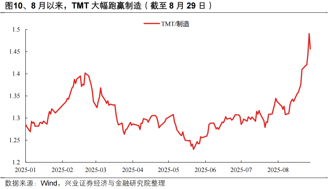 首先,科技成长主线内部,8月以来TMT大幅跑赢制造,后续制造板块凭借自身产业逻辑有望吸引追求弹性收益的资金进行“高切低”配置。其中,新能源产业链作为前期滞涨较多的板块,有望迎来轮动补涨机会。