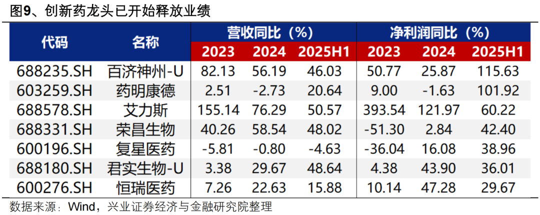 其次,创新大周期下,多家创新药企产品获批上市销售,产业链逐步进入商业化阶段,龙头业绩已迎来释放。25H1,以百济神州、药明康德、恒瑞医药为代表的创新药产业链龙头公司均有亮眼业绩表现。在新技术创新药和潜力大单品驱动下,企业多年来的投入迎来收获,产业链有望进入新一轮业绩释放期。