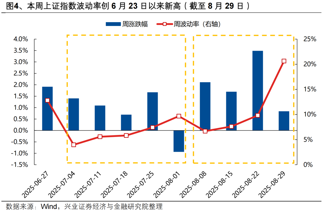 但极致分化下,市场波动率也在明显放大,上证指数本周波动率创下自6月23日本轮上行行情以来的新高。