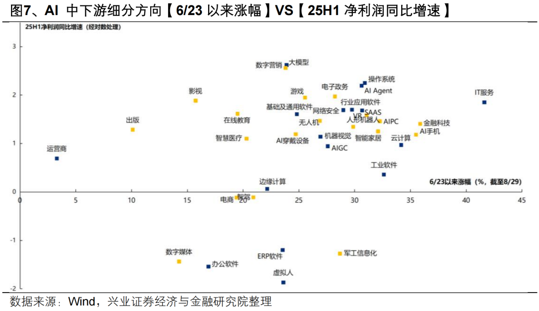 软件应用:6月以来上游算力持续跑赢中游软件服务&下游端侧应用,当前上游算力行情极致演绎后,关注向中下游软件应用的扩散。结合景气、后续催化、股价位置等维度,关注中游软件服务(云计算、大模型、AIAgent、SAAS)、下游应用(消费电子、游戏、人形机器人、智慧医疗、电子政务)。