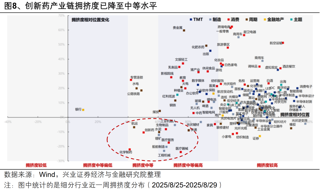 首先,经历前期调整,当前创新药产业链拥挤度已降至中等水平,是当前成长主线中情绪消化已较为充分的细分方向。