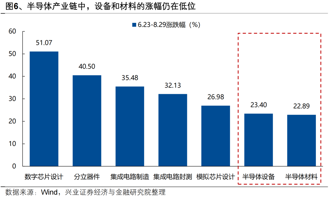 半导体设备材料:国产算力β行情启动,国产AI芯片、GPU等核心龙头率先上涨,与北美算力链龙头相比涨幅仍低,长期继续关注。同时国产替代全产业链受益,行情有望持续深化,产业链内部重视向半导体设备材料等上游低位方向的扩散,受益于国产芯片下半年产能放量,具备补涨逻辑。