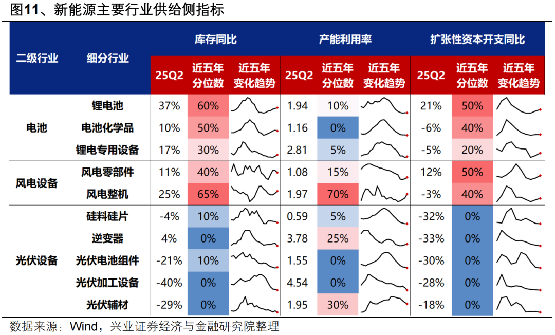 其次,中报数据来看,产业链加速出清、供需格局改善的信号进一步强化,基本面正在逐步走出底部。近两年新能源行业供给经历加速出清,其中电池、风电零部件等环节25Q2已出现补库和加大资本开支迹象,开工率或将率先迎来拐点,业绩有望先行企稳修复。光伏产业链的新增供给持续放缓,库存同比、产能利用率和扩张性资本开支均降至历史底部,供给正在加速出清。