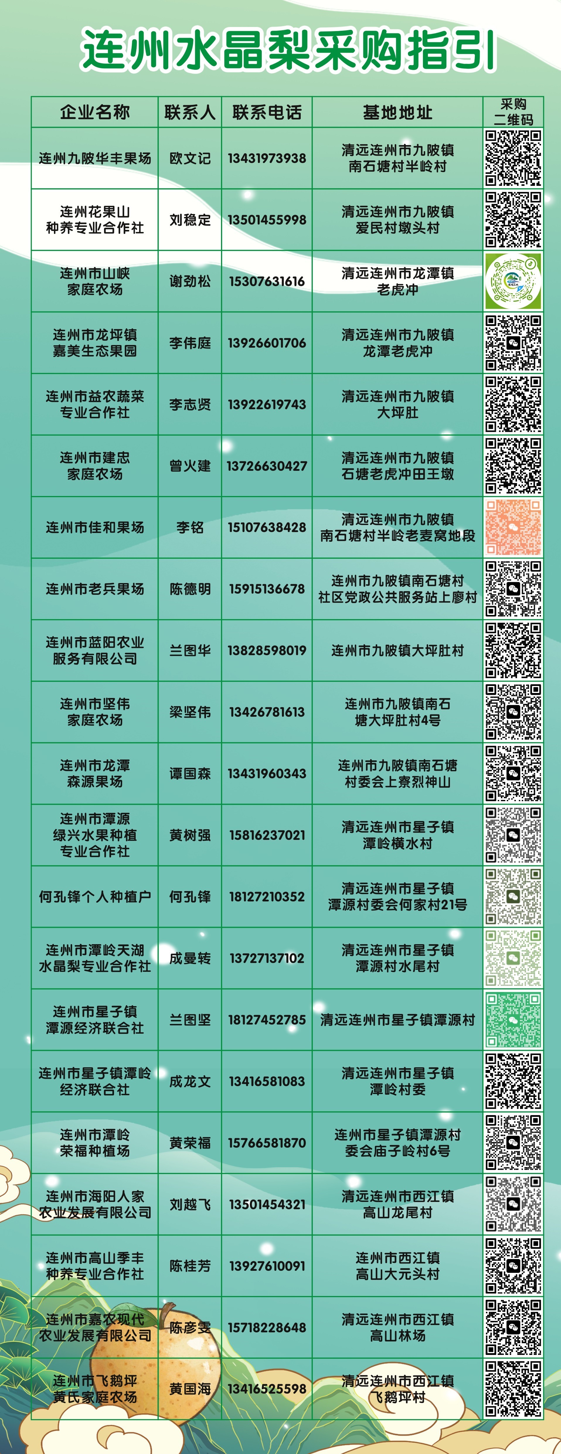 近日,连州市农业农村局通过组织梳理,精选出超80家优质连州水晶梨推荐果园,从种植到采摘均严格把控品质,汇编成《2025年连州水晶梨采购指引》,现诚邀各位采购商前来预定,让这份来自连州的甜蜜,传递到更多人的舌尖。